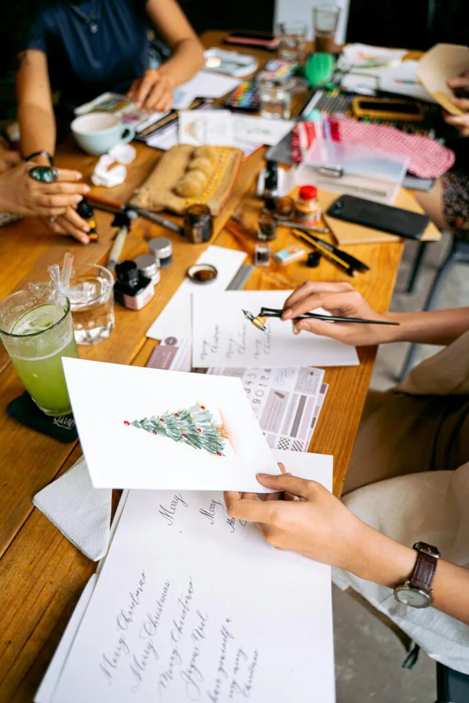 Diseñaréis y pintaréis vuestras propias tarjetas navideñas, guiados paso a paso en un ambiente relajado y festivo.