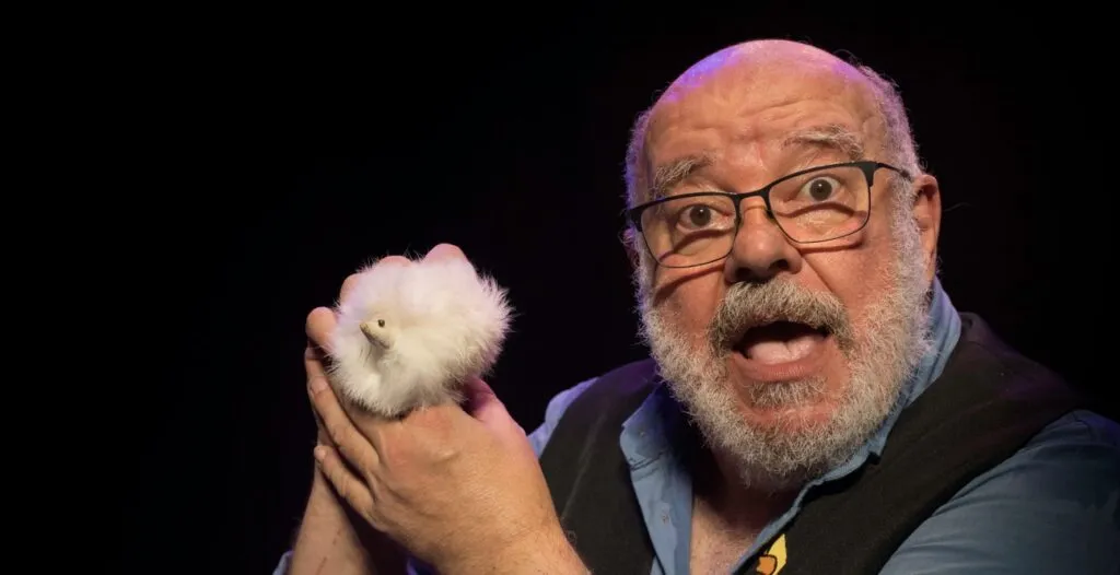 Saldaña apoya la palabra en los objetos cotidianos, en los juegos de magia, en muñecos y marionetas, en su cuerpo y en su voz.