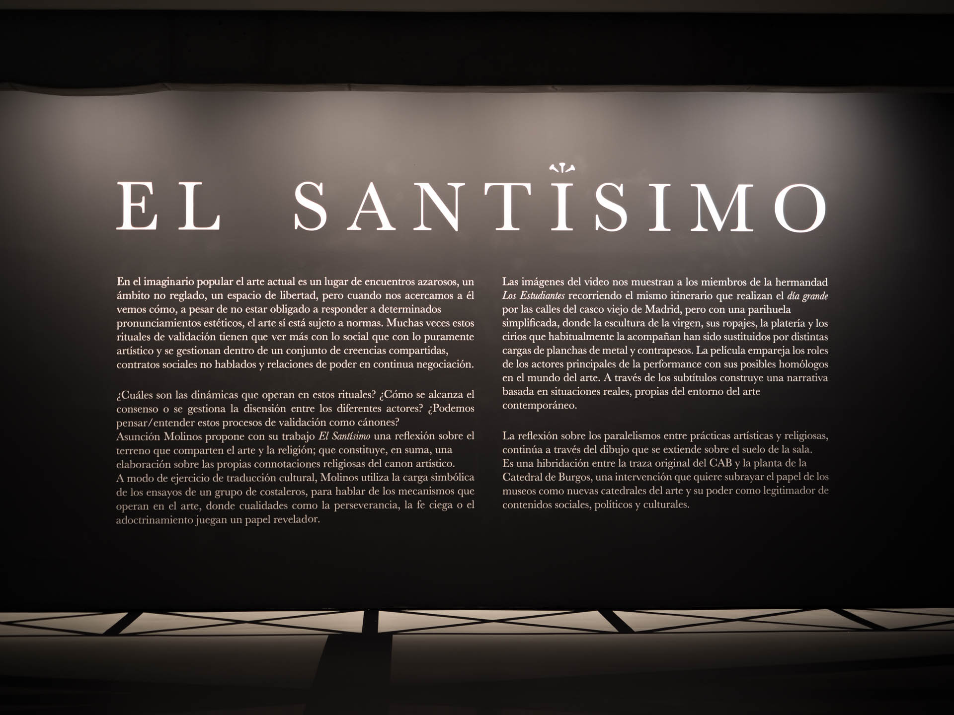 El ejercicio de traducción cultural que propone Asunción Molinos emplea los ritos y la simbología propias de un colectivo de costaleros para mostrar cómo es y cómo se organiza el mundo del arte contemporáneo. La artista ha dispuesto un espacio neutro, en el que la imagen se apodera de la sala como si se tratara de un gran cuadro de altar.