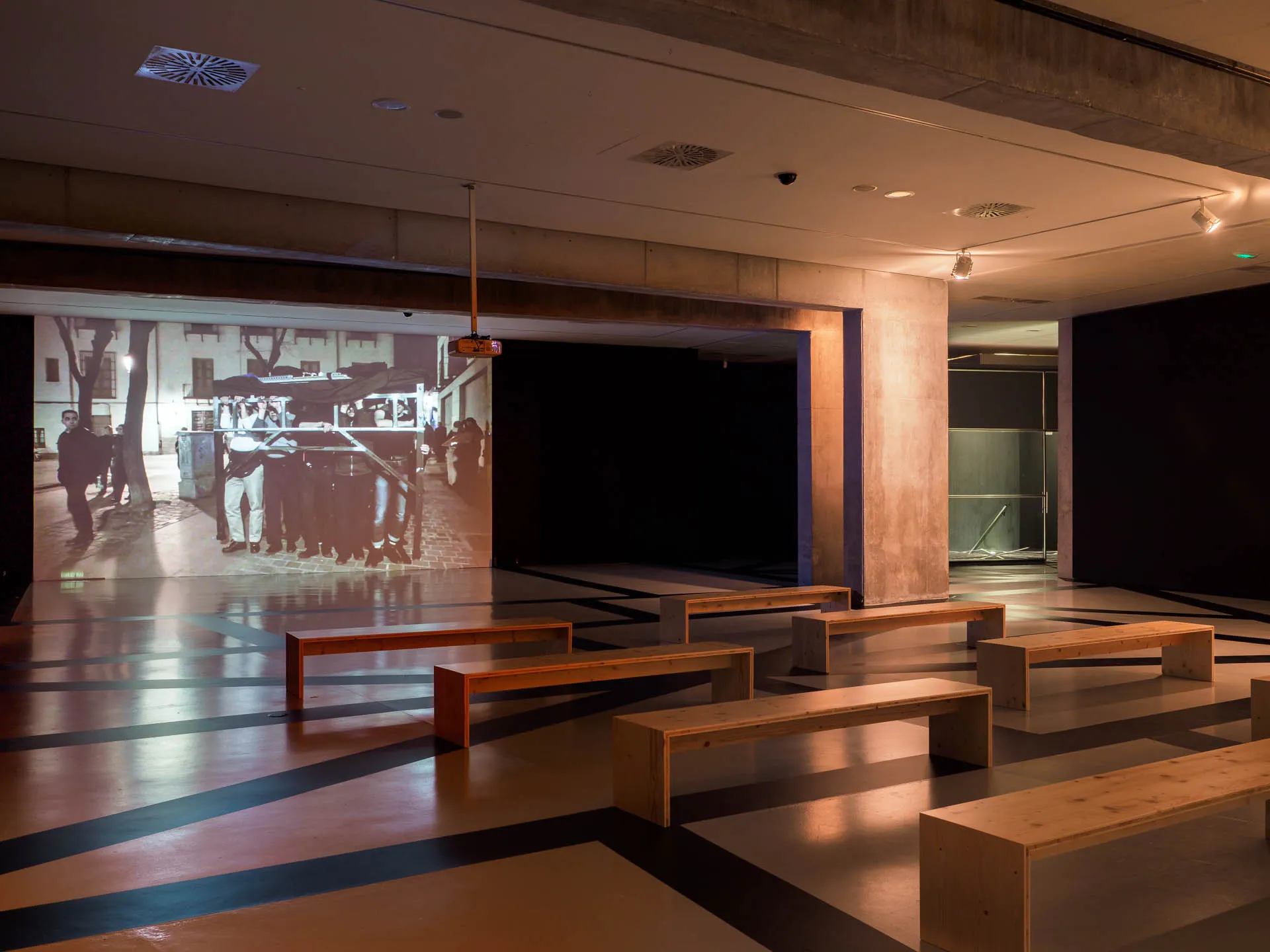 El sonido domina por completo un espacio cuya desnudez ayuda a reforzar la presencia de diferentes elementos expositivos, normalmente invisibles, pero necesarios en toda instalación museográfica: extintores, cuadros de luz, pedestales vacíos o enchufes se erigen en los protagonistas de la sala.