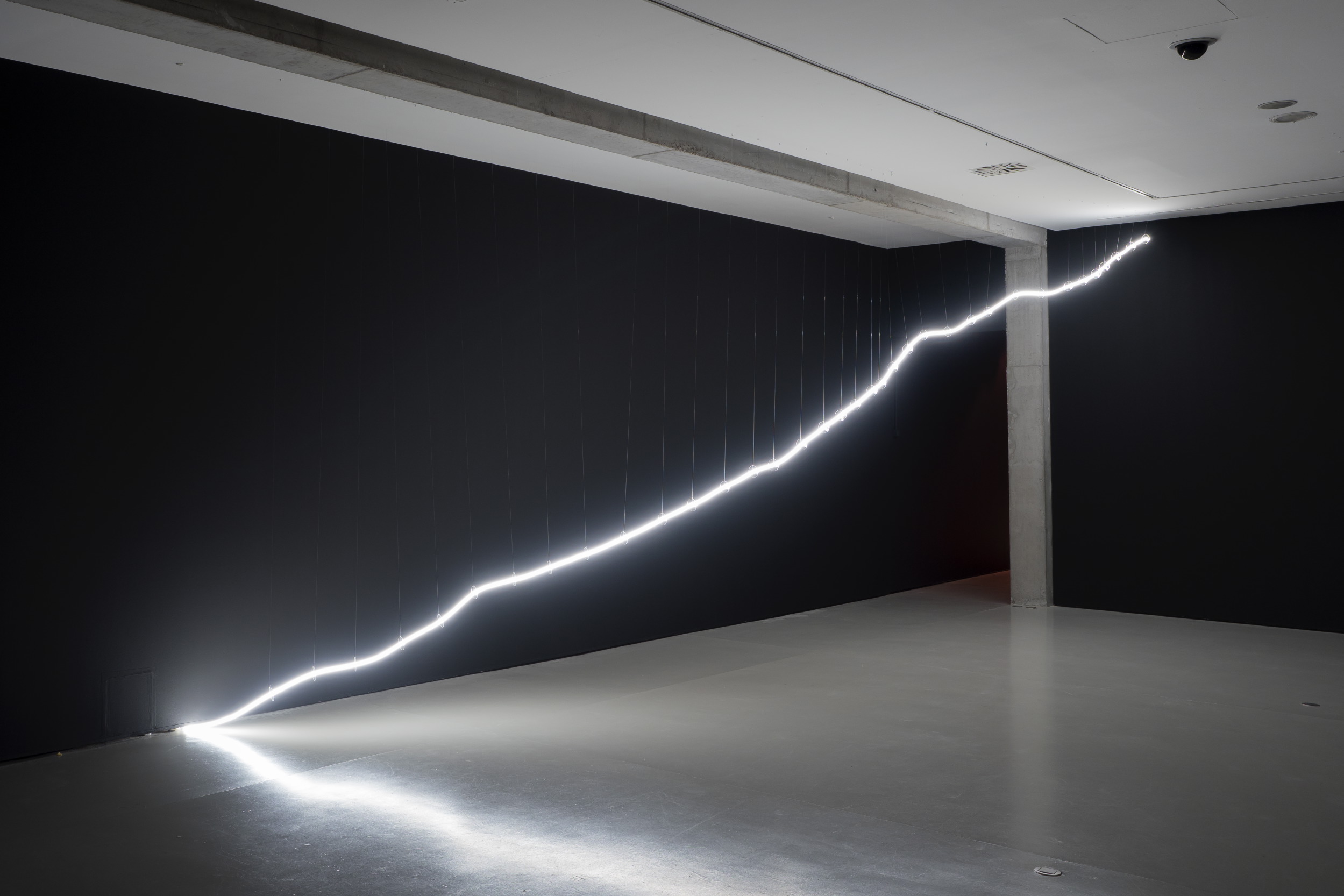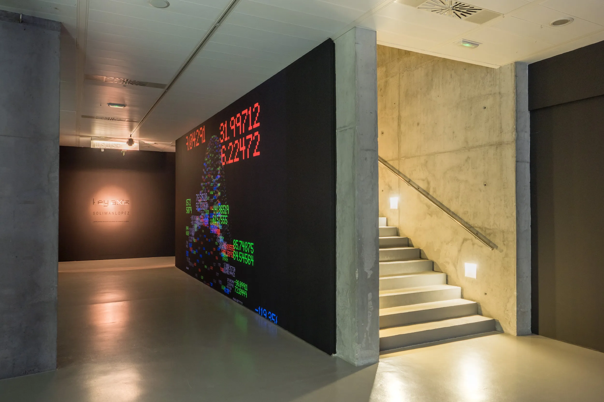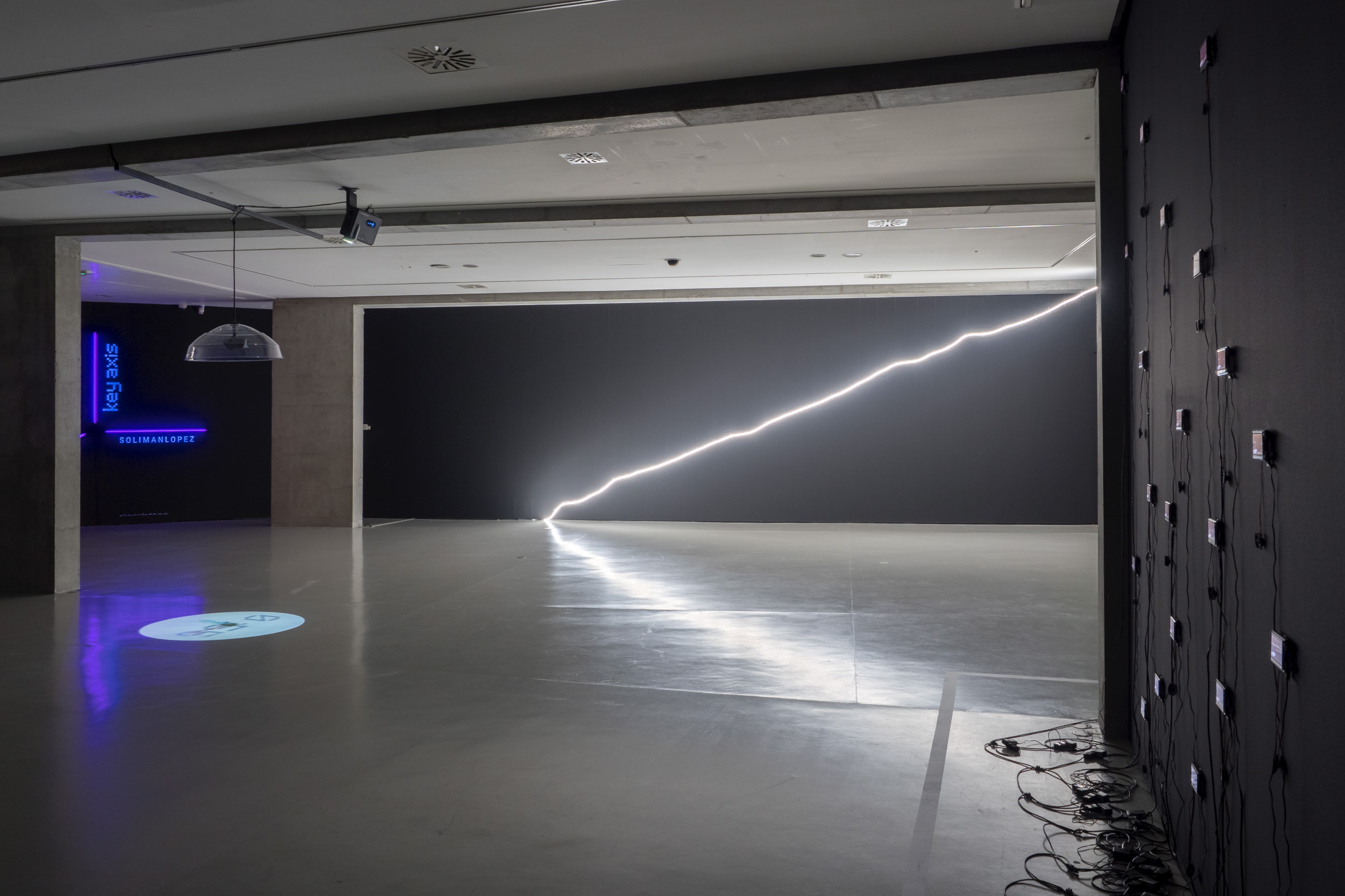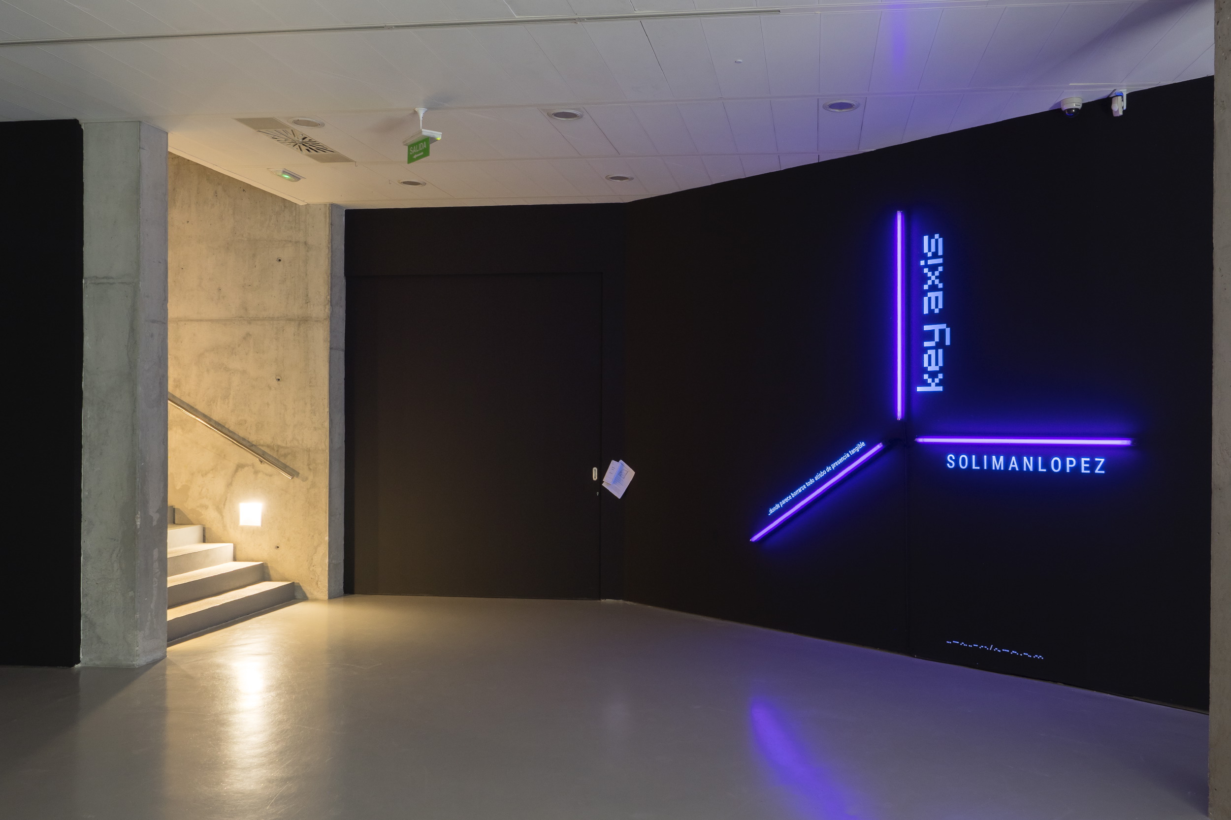 Bajo el título de Key Axis, el proyecto desarrollado de modo específico para su presentación en Burgos, Solimán López construye una instalación múltiple que se despliega en cuatro elementos diferentes y a la par interconectados entre sí. El espacio físico se transmuta en un espacio virtual donde parece borrarse todo atisbo de presencia tangible, mientras se nos interroga sobre el lugar cierto que creemos ocupar en el mundo. Arte creado en tiempo real aparentemente efímero en su manifestación digital, pero de inmediato recogido y reservado. Experiencias sensoriales remitidas desde la distancia fría de una pantalla que percibimos como parte de nuestro ser. La confusión entre existencia y presencia, la conversión de estas en meros códigos almacenados y preservados en archivos digitales, ya ni siquiera necesitados de soportes físicos, o la pérdida de toda referencia objetual son resueltas mediante el empleo de nuevas técnicas de geolocalización y captura de movimiento.