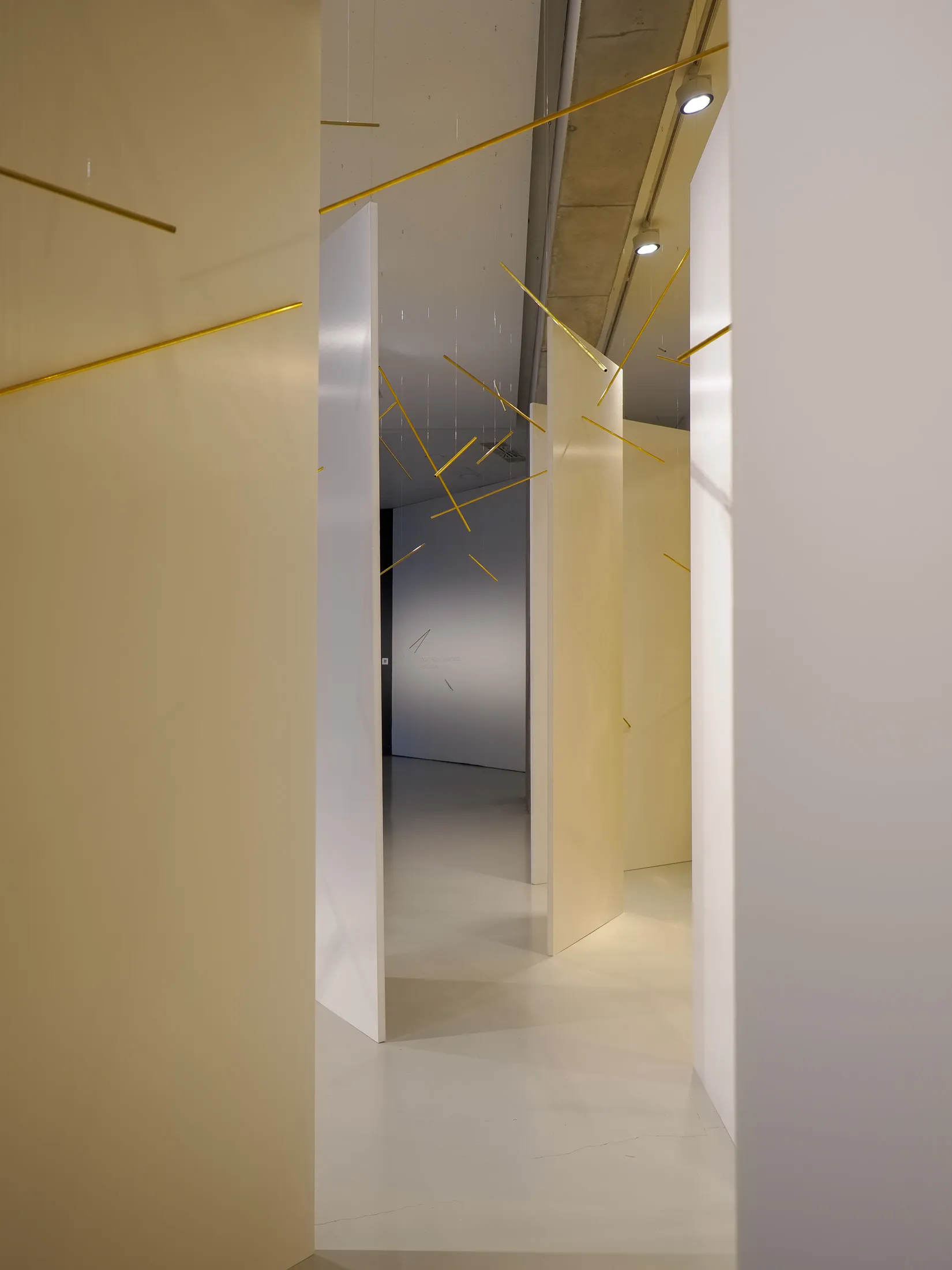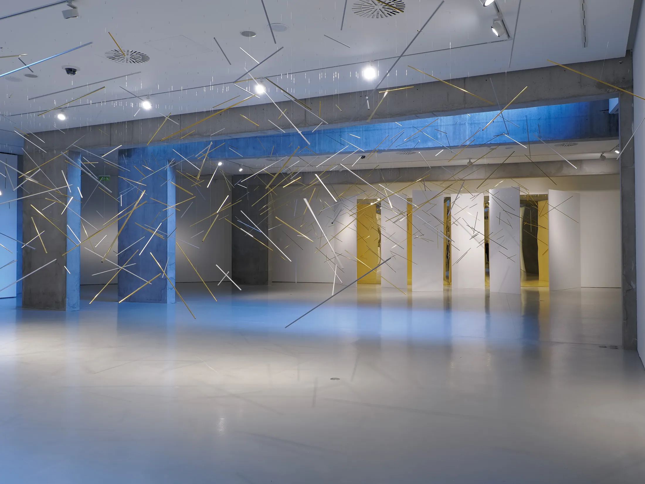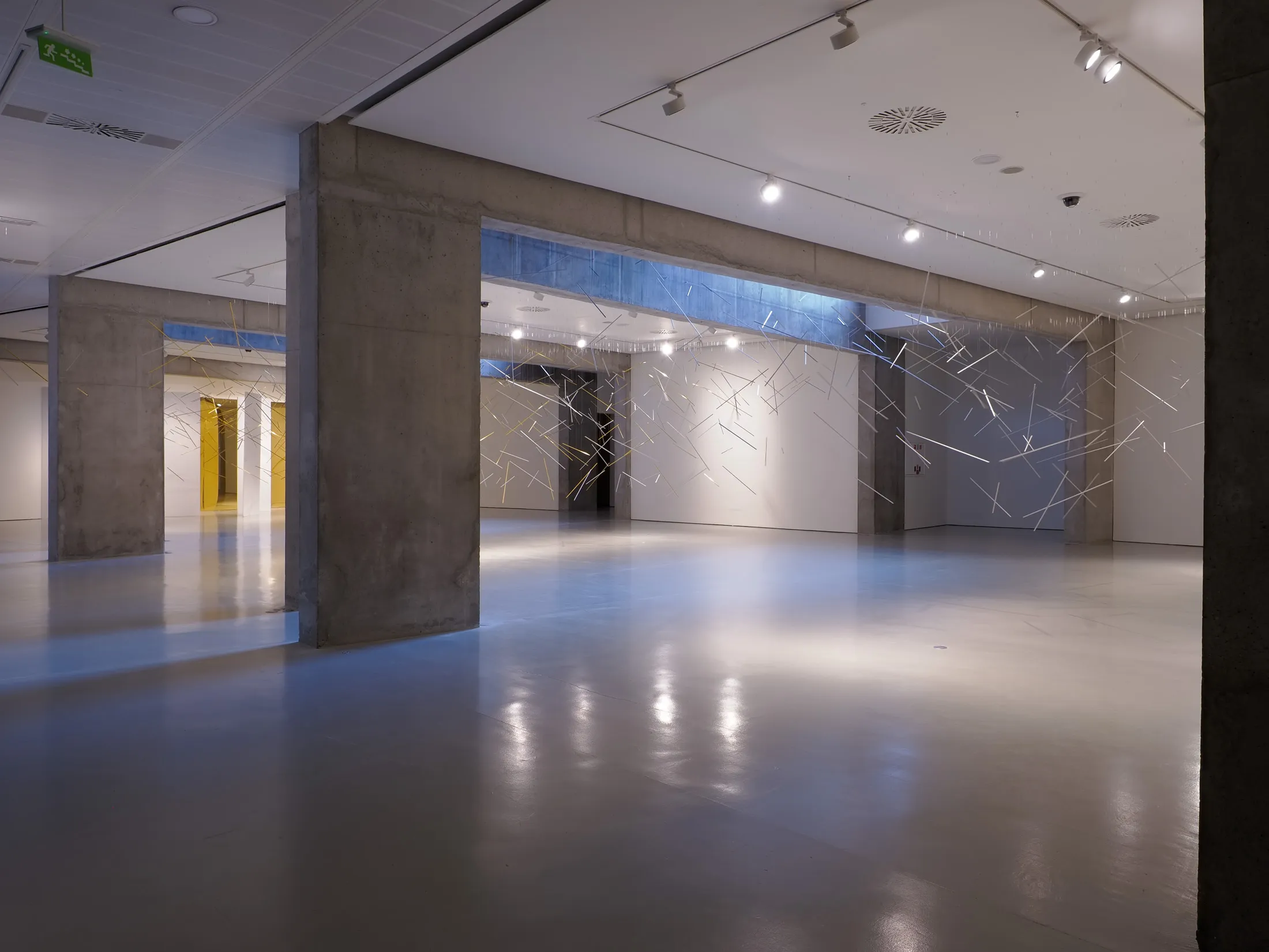 La percepción del espacio expositivo como algo consolidado, inmutable e indiscutido se ve alterado en la instalación expandida que nos propone el artista. El gran receptáculo que compone el nivel -1 del CAB es tratado como un todo, como una generosa caja lumínica en la que una miríada de piezas suspendidas trastoca la estructura arquitectónica sin intervenir en ella. Los efectos, los reflejos, la multiplicación tonal emanada desde los diferentes elementos componen una atmósfera teñida de sutiles variaciones, cercanas a la irisación. En cierto modo Ferrer i Martorell dibuja sobre el aire líneas móviles que imposibilitan una sola impresión, una sola compartimentación del espacio, una única y sólida configuración.