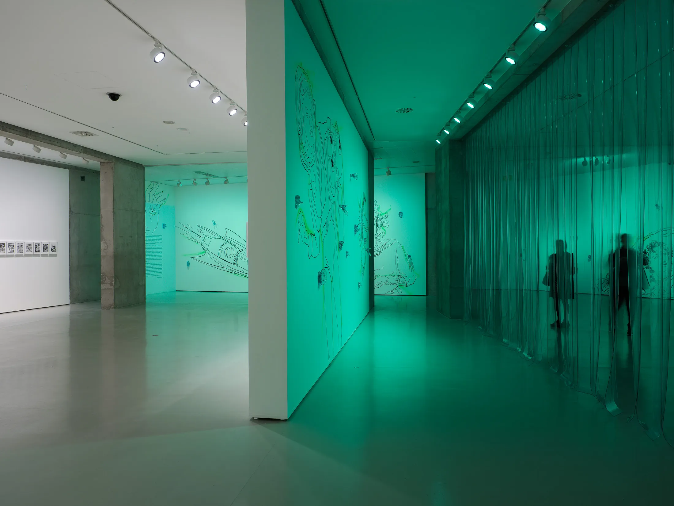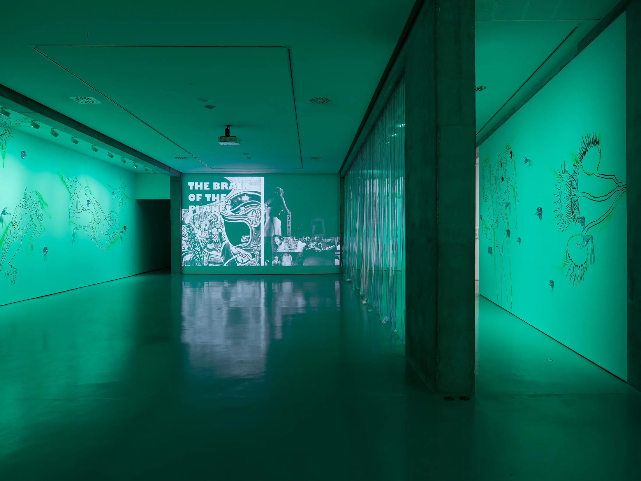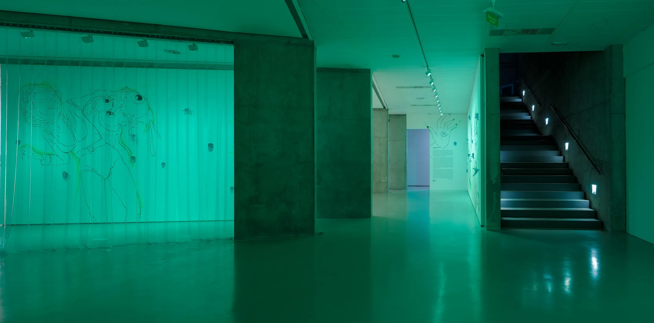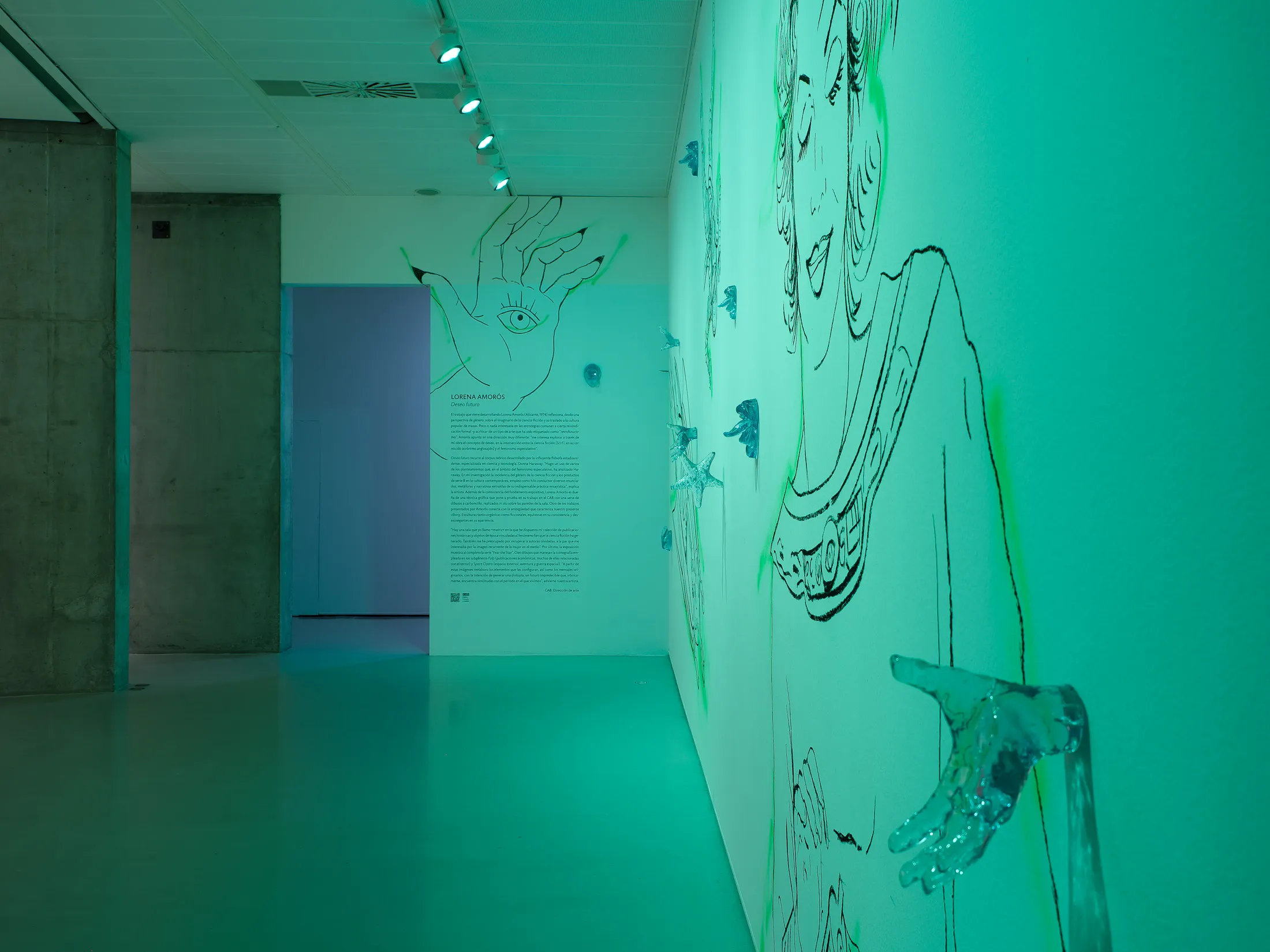 Además de la consistencia del fundamento expositivo, Lorena Amorós es dueña de una técnica gráfica que pone a prueba en su trabajo en el CAB con una serie de dibujos a carboncillo, realizados in situ sobre las paredes de la sala y en un formato imponente. “Con ellos propongo un relato distópico donde conviven fuerzas creadoras y destructivas, dando protagonismo a la figura femenina y alejándome de la imagen vulnerable que históricamente se nos ha atribuido”, relata la artista. En sintonía con Donna Haraway, la ciencia ficción es teoría política [“science fiction is political theory”] y por tanto encierra un potencial transformador y liberador.