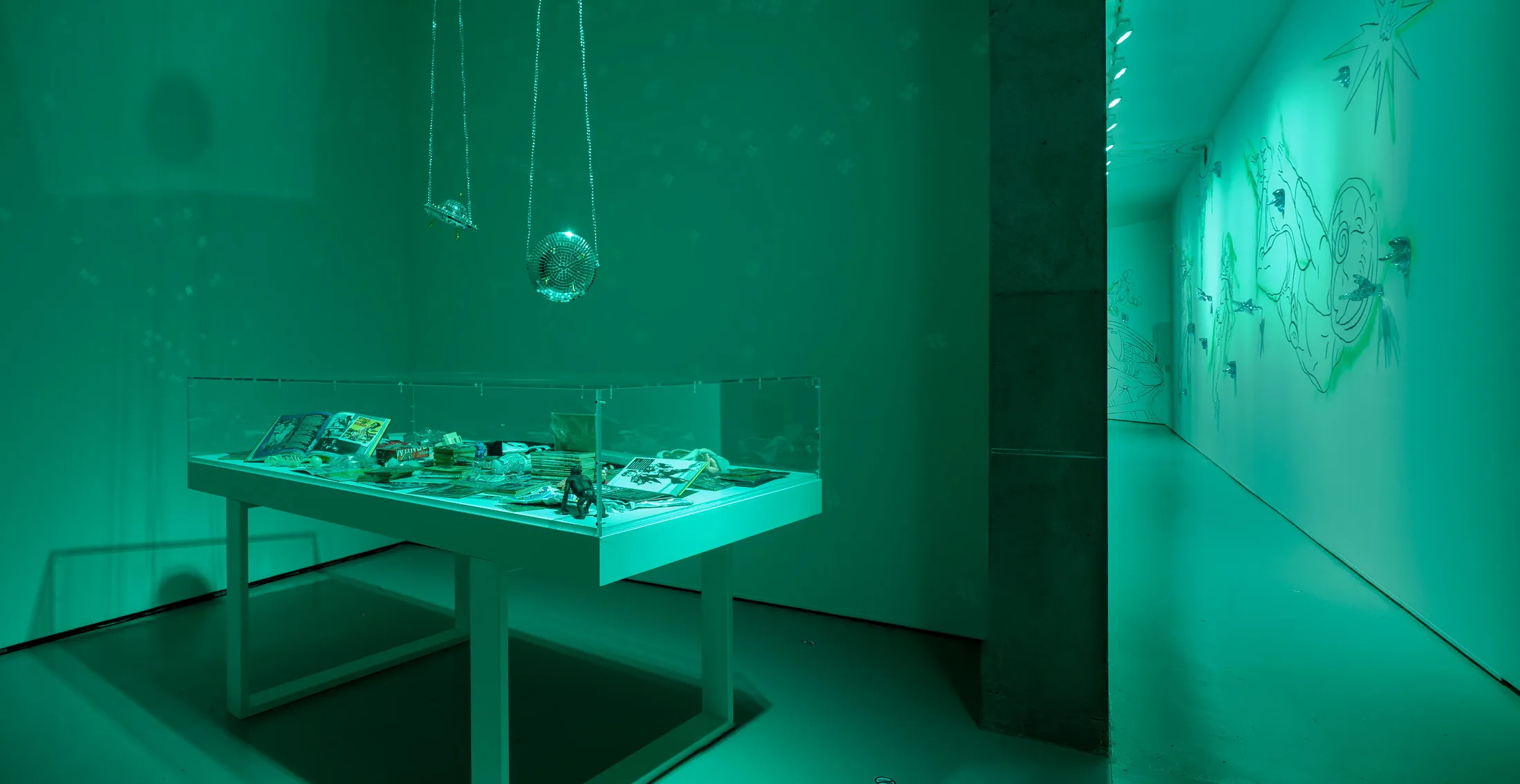 Otro de los trabajos presentados por Amorós para Deseo futuro conecta con la ambigüedad que caracteriza nuestro presente cíborg. Esculturas tanto orgánicas como ficcionales, equívocas en su consistencia y desasosegantes en su apariencia. Su cercanía con la estética de la Sci.Fi no esconden una cierta ironía, inherente en las imágenes atormentadas propias de los materiales protésicos empleados en el atrezzo paracientífico. “Hay una sala que yo llamo «matriz», señala Amorós, en la que he dispuesto mi colección de publicaciones históricas y objetos de época, que he ido incorporando a mi archivo personal a lo largo de los años como parte de la investigación que se ha materializado en este proyecto. “Hay artefactos bizarros junto a enseres procedentes del cine, portadas musicales rock y punk o revistas vinculadas al fenómeno fan que la ciencia ficción ha generado, comenta Lorena Amorós. También me he preocupado por recuperar a autoras olvidadas, a la par que me interesaba por la imagen recurrente de la mujer en el medio”.