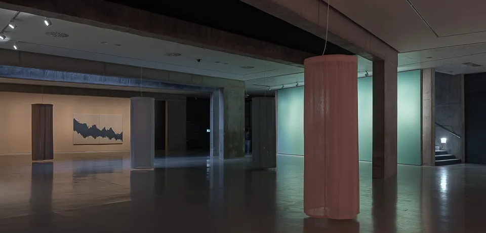 La propuesta de Virginia Rivas (Madrid, 1981) para el CAB parte de la clasificación de ruidos en el espectro sonoro y su identificación cromática, con arreglo a lo que se ha llamado la densidad de su potencia desde la que se establece una analogía entre la onda visible y la audible. Según la clasificación comúnmente aceptada, cuando la densidad espectral de potencia de un ruido es uniforme, se identifica con el blanco, mientras que el color se define en función de los usos de tonos graves y frecuencias bajas. Blanco, rosa, gris, verde y marrón son los ruidos y los colores que determinarán cinco instalaciones complementarias y a la par independientes. Unas columnas traslúcidas convocan al espectador a sumergirse en la textura sonora elegida por la autora. La visión desde el interior transforma el espacio y altera la coloración del resto de instalaciones, mientras reafirma la coincidente en espectro y tonalidad.