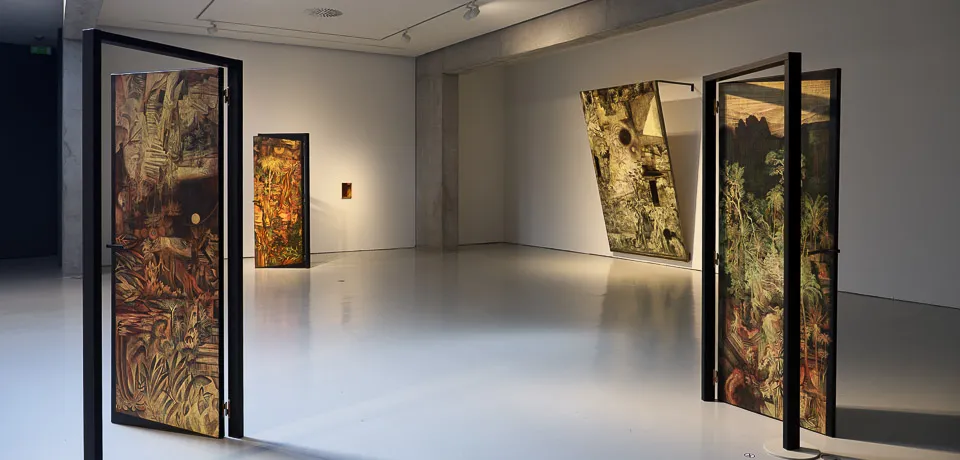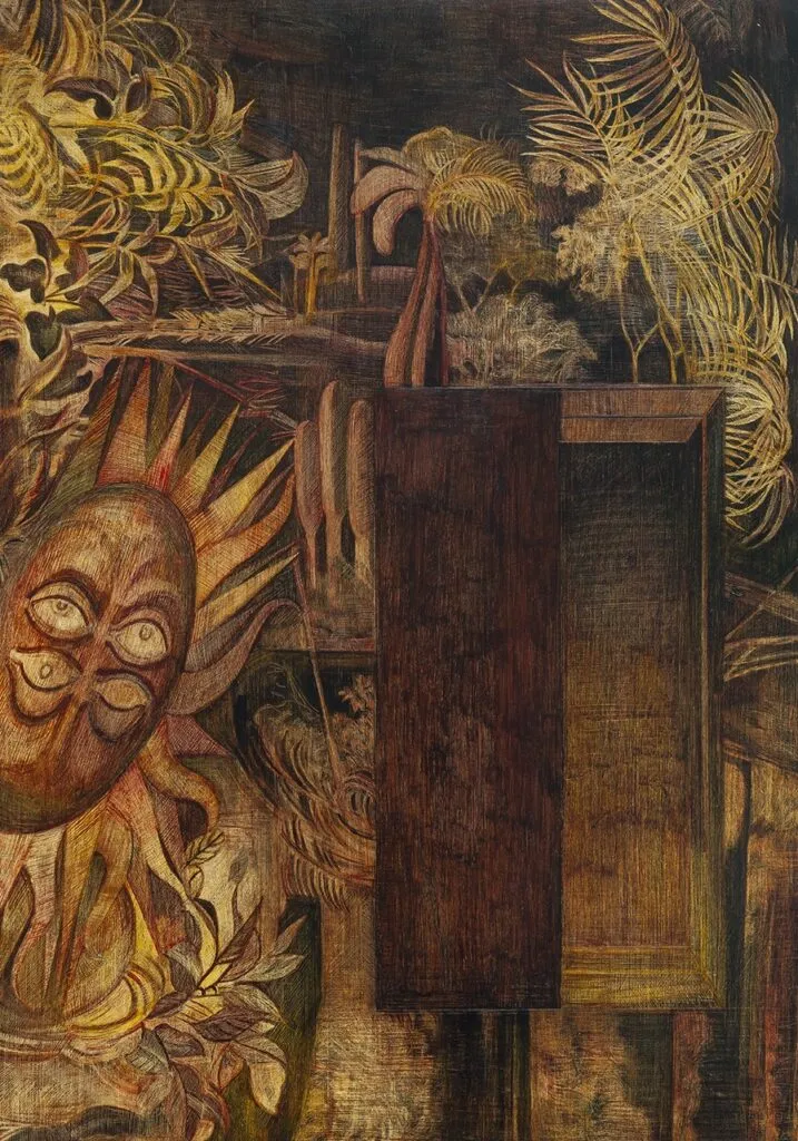 Ercole recurre a una técnica poco habitual en la práctica contemporánea: el esgrafiado, empleado como una metodología de excavación. Cada incisión hace aflorar capas de luz y color que alteran la percepción del paisaje y cuestionan los códigos tradicionales de su representación. Este gesto enlaza referencias latinoamericanas —lo salvaje y lo mítico, desde los imaginarios antropofágicos de Tarsila do Amaral hasta los registros viajeros de Johann Moritz Rugendas— con la herencia europea del paisaje entendido como arte del orden y la proyección cultural.