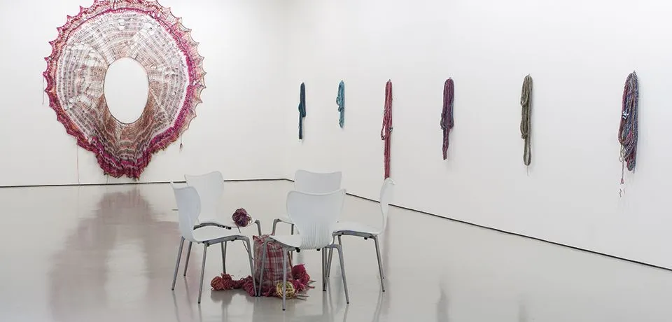 Los cabeceros capitonés de la venezolana Clemencia Labin están acolchados de trazos de memorias coloristas y texturas vibrantes que retrotraen a la artista a la infancia, y a nosotros tal vez nos sugieran al tiempo escenas de dolor y alegría excesivas; lo que es también el elemento motor en la práctica artística del italiano-australiano Aldo Iacobelli, para quien los papeles de empapelar interiores de habitaciones, unidos a unas frases punzantes que recorren sus cuadros, hablan de situaciones íntimas que revelan la complejidad de nuestras existencias; también los objetos híbridos de Edith Dakovic, hechos de trozos de silicona y tatuados con sus memorias y vivencias hablan de migraciones, pérdidas y “segunda piel”; por su parte, Shane Waltener crea puntos de encuentro donde las personas son invitadas a hacer ganchillo e intercomunicarse en un deseo por la autosuficiencia en un mundo globalizado; finalmente, las maletas del ruso-alemán MK Kaehne, pertrechadas con los utensilios básicos de supervivencia, recuerdan de manera nítida el concepto de la “casa a cuestas” en un mundo cada vez más abierto pero también más hostil al otro.