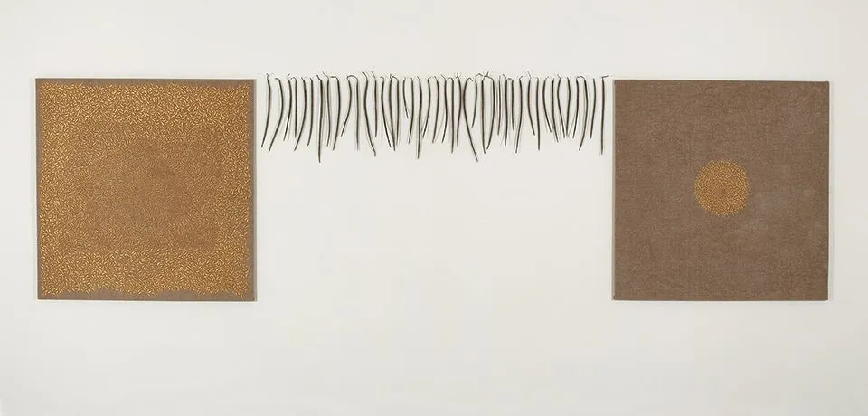 Y Concha Sáez, que en esta ocasión ha dado a su obra un cierto aspecto escenográfico. Pintura como suma de fragmentos que dan a su espacio el carácter de instalación pictórica en la que lo sensorial, una cierta carga ornamental y el sentimiento por lo femenino conforman un trabajo de una gran intensidad visual.
