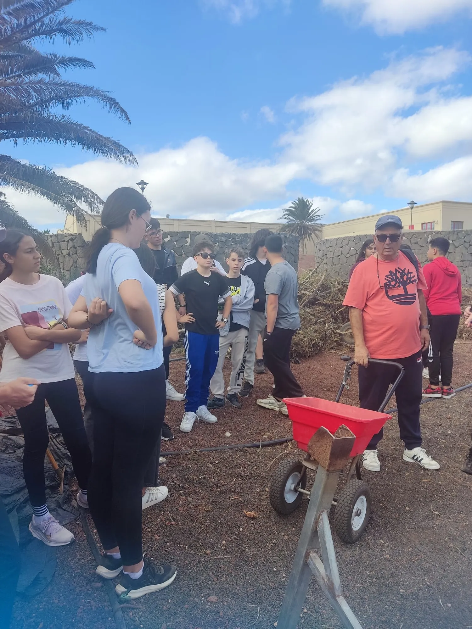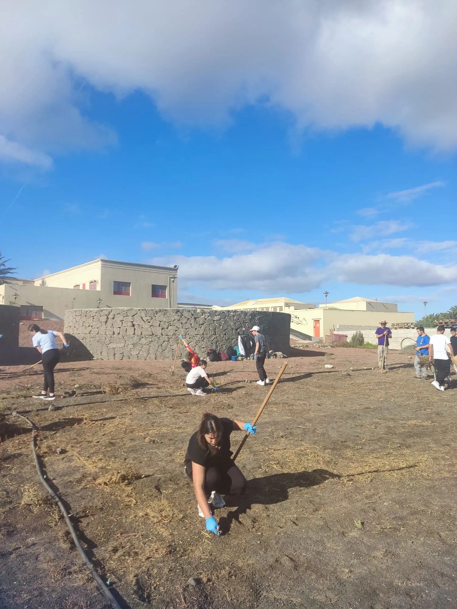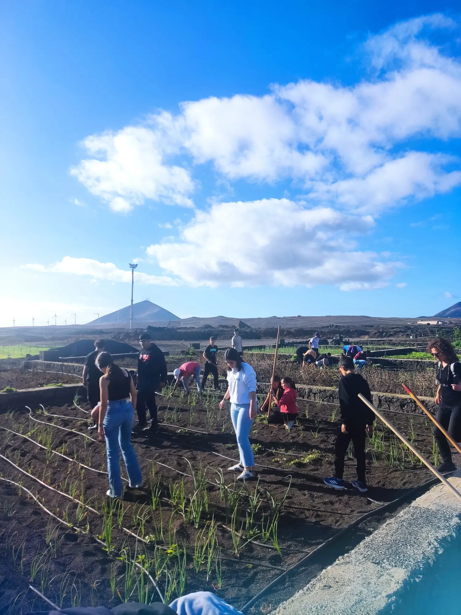 Día 11 de noviembre, Lanzarote Erasmus AGE. Este martes seguimos con nuestro aprendizaje y trabajo sobre el proyecto. Hemos visitado el complejo agroindustrial de Teguise. Primero se han realizado labores de limpieza para luego abonar y plantar las famosas papas que cada noche comemos con mojo verde y rojo.
