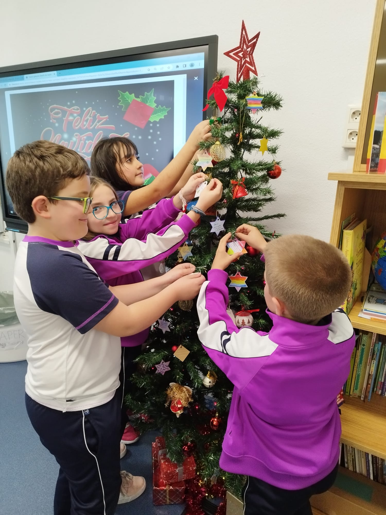 Además, hemos decorado el árbol de Navidad de una forma muy especial. Hemos colgado nuestros propios deseos para esta Navidad creando así nuestro Árbol de los Deseos. Para ello hemos fabricado unas estrellas de seis puntas que hemos coloreado, escrito y colgado en el Árbol. Este año el deseo más anhelado por nuestros alumnos es «que se acaben las guerras», ojalá que así sea.