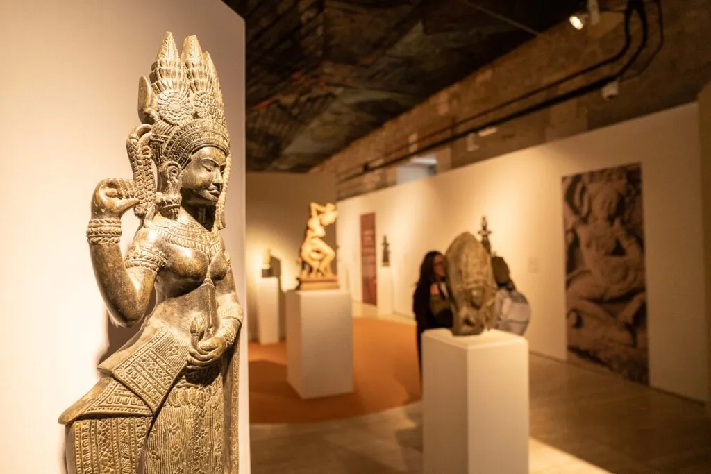 La exposición se organiza en cuatro grandes ámbitos temáticos. El primero, dedicado a las apsarās, muestra estas figuras danzantes como símbolos de tránsito entre el mundo humano y el celestial. Su movimiento detenido expresa gracia, agua y paso espiritual, marcando los umbrales de acceso a lo sagrado en los templos jemeres.